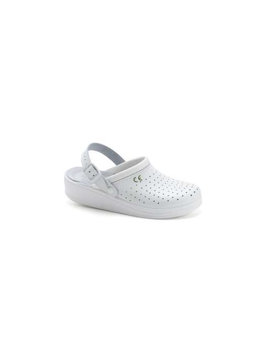 Zoccolo in pelle forata traspirante di colore bianco, ecologico, leggero e flessibile, alta resistenza all'abrasione, collo del piede imbottito, cinturino regolabile tramite fibbia, retraibile dal tallone al collo del piede, soletta in pelle anatomica e traspirante, suola in poliuretano monodensità antiscivolo ed antistatica con assorbimento di energia nel tallone.