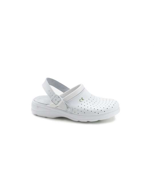 Zoccolo in pelle forata traspirante di colore bianco, ecologico, leggero e flessibile, alta resistenza all'abrasione, collo del piede imbottito, cinturino regolabile tramite fibbia, retraibile dal tallone al collo del piede, soletta in pelle anatomica e traspirante, suola in poliuretano monodensità antiscivolo ed antistatica con assorbimento di energia nel tallone.